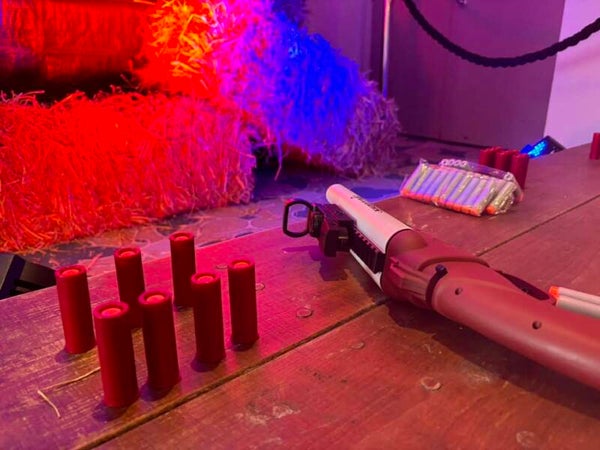 We have created this custom air-soft indoor shooting range, using 2 sawn-off double barrel shotguns,